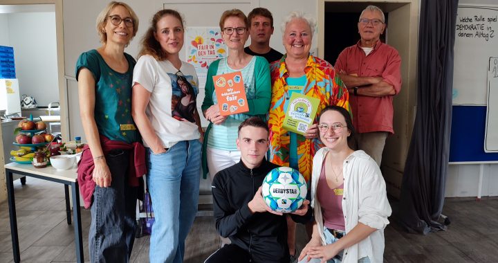 Bild (Nils/HoT) von links nach rechts: Sonja Wuttke, Phyllis Kohnen, Renate Adams, Patrick Book, Claudia Thelen, Rudi Kirwald und vorne: Teilnehmer Mino mit fairem Fußball und Pauline Krier